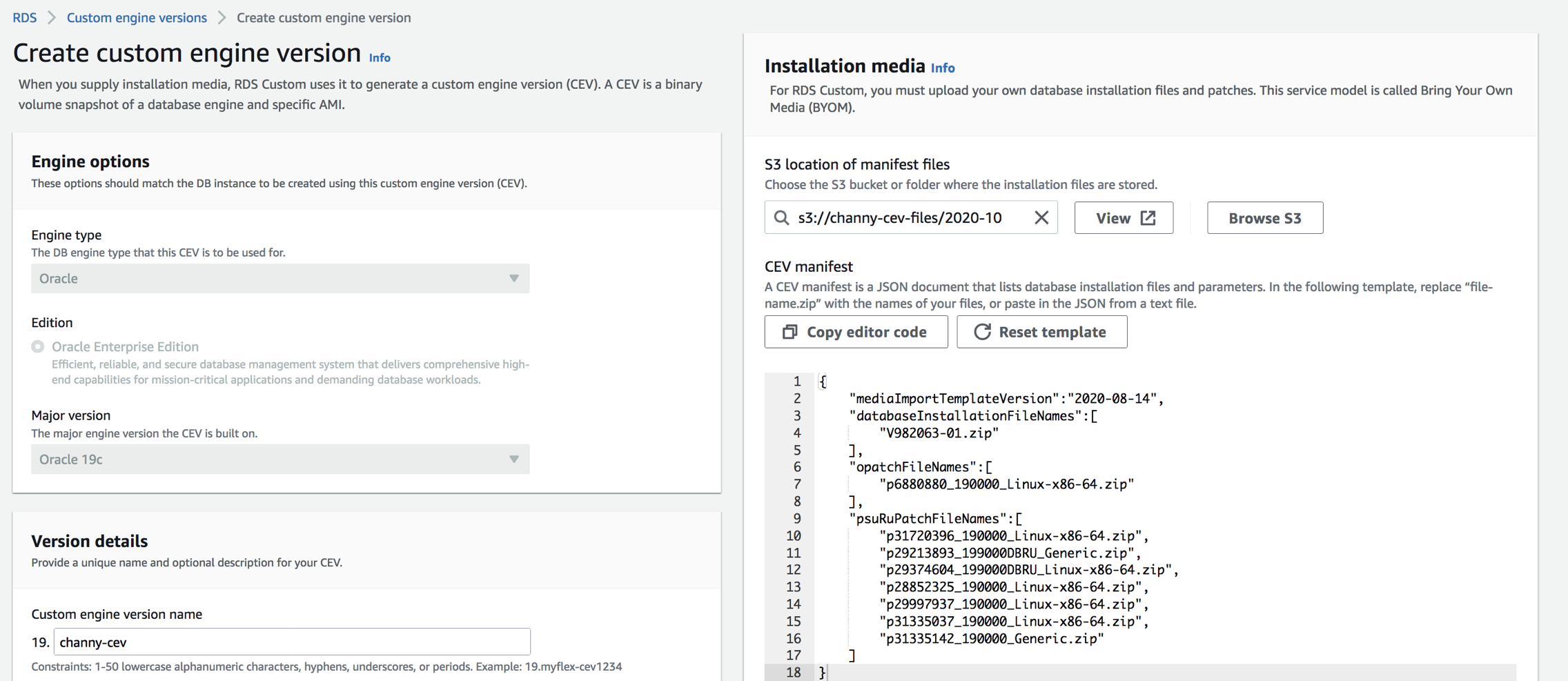 要创建用于创建数据库实例的 CEV,您需要一份 CEV 清单,这是一个 JSON 文档,用于描述存储在 Amazon S3 中的 .zip 安装文件。面向 Oracle 的 RDS 自定义将按照使用此 CEV 创建实例时列出的顺序应用各个补丁。