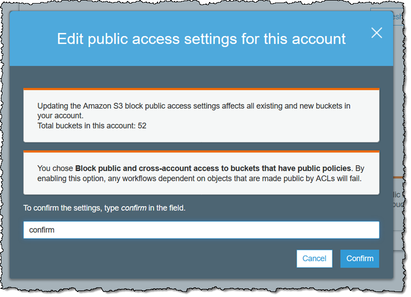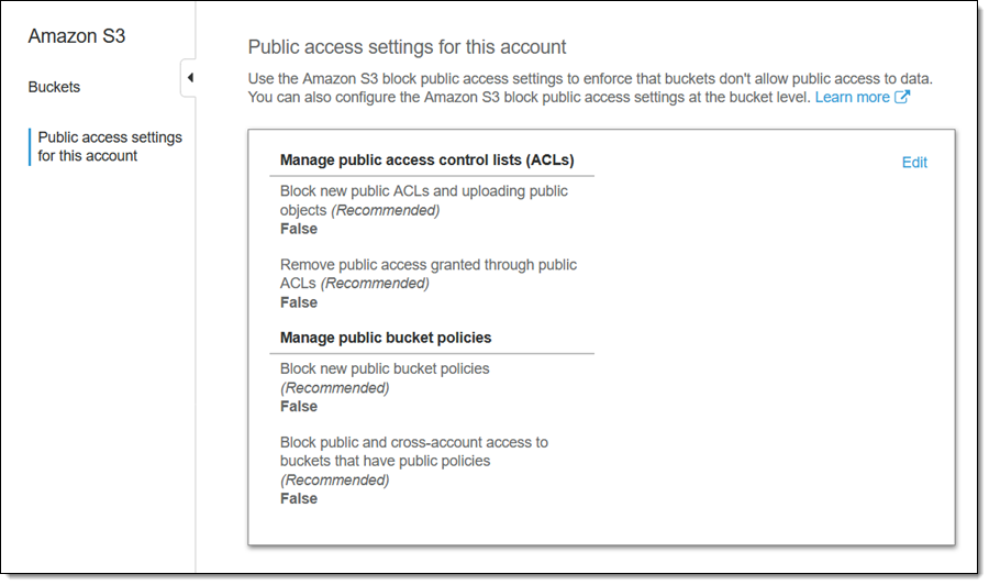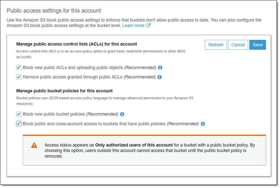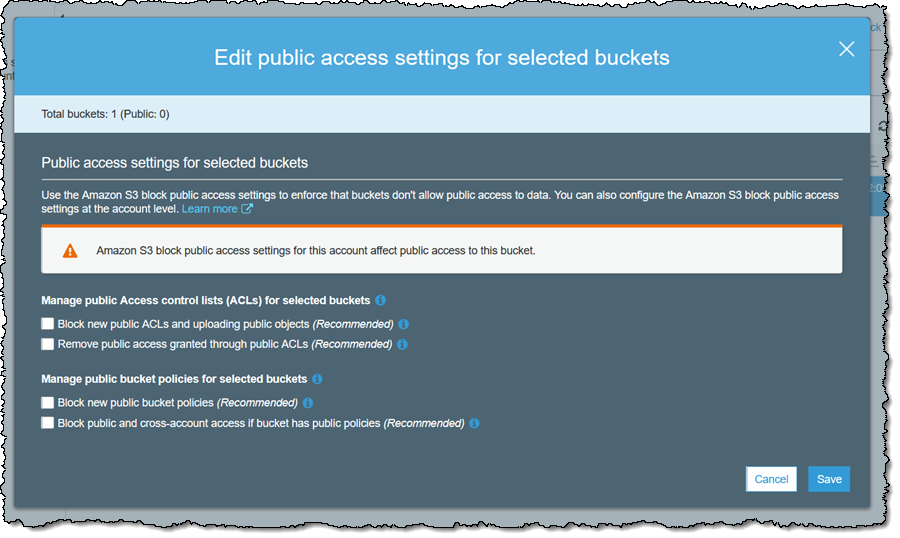 由于我已经在账户级别拒绝所有公有访问权限,这实际上是多余的,只是让您了解您在存储桶级别拥有的控制机制。需要注意的是:我无法通过修改存储桶级别的设置来覆盖账户级别的设置。