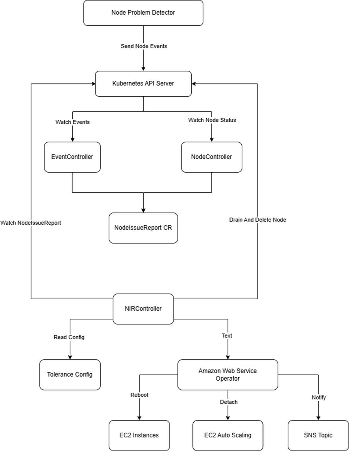 - NIRController 在接收到 NodeIssueReport 资源的变更之后,通过与用户的 Tolerance 配置作对比,判断是否要进行 Reboot 或 Replace 操作