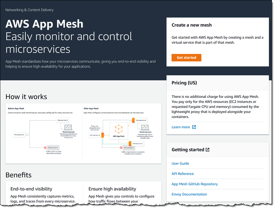 Service Mesh – 位于其中的服务之间的网络流量的逻辑边界。网格可以包含虚拟服务、虚拟节点、虚拟路由器和路由。
