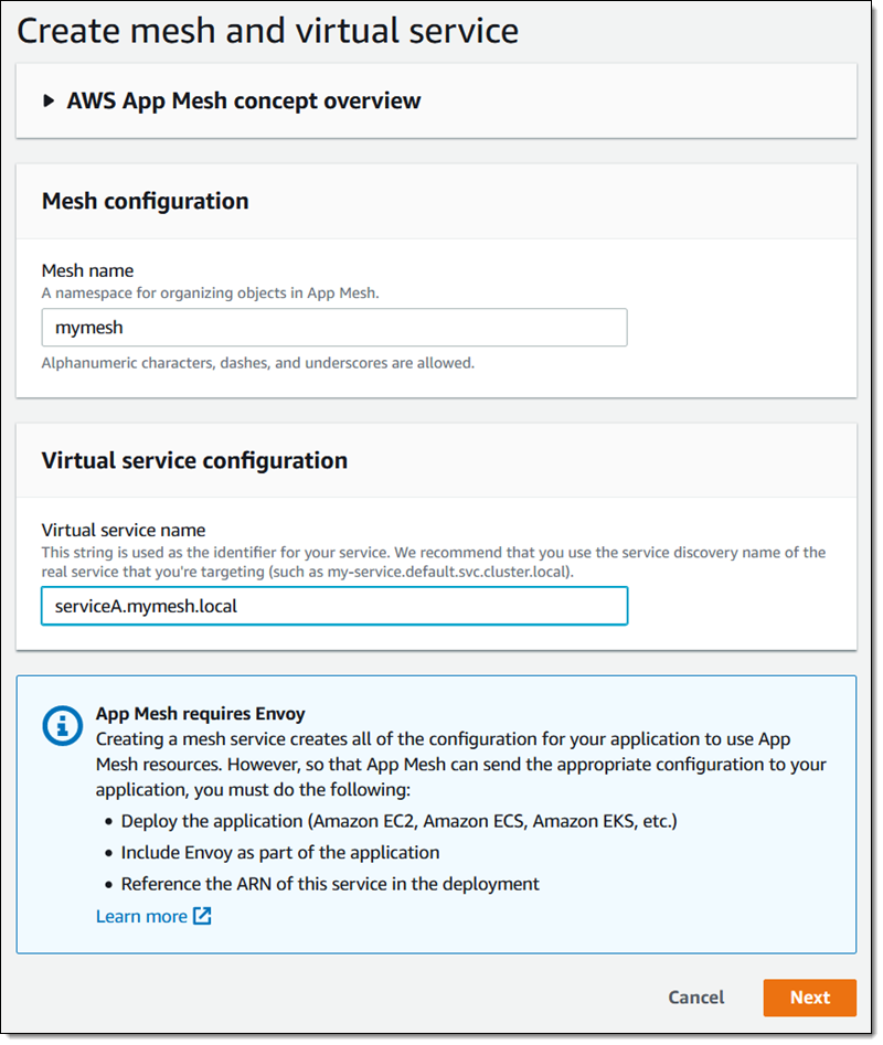 输入网格名称和第一个虚拟服务(我可以稍后添加),然后单击 Next(下一步):