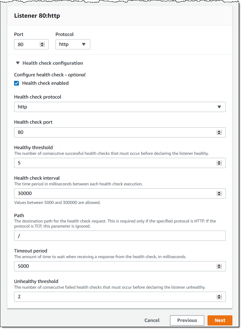 我通过协议(HTTP 或 TCP)和端口定义节点的侦听器,设置可选的运行状况检查,然后单击 Next(下一步):