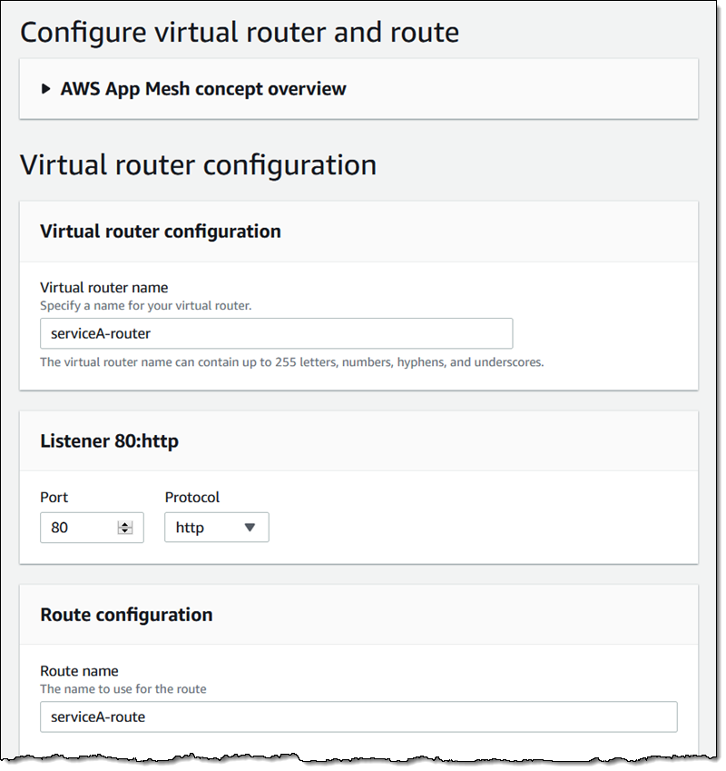 App Mesh 允许您以简单的 JSON 格式指定每种类型的组件,并为您提供创建每个组件的命令行工具(创建网格、创建虚拟服务、创建虚拟节点和 创建虚拟路由器)。例如,我可以在文件中定义虚拟路由器: