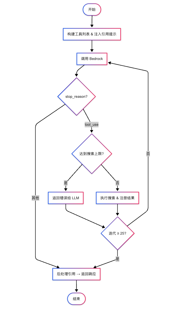 stop_reason != tool_use→ 后处理引用标记,组装最终响应 → 结束