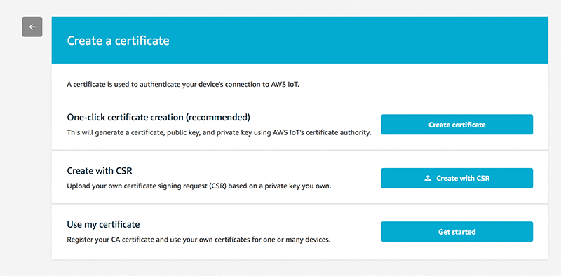 保证安全的另一种方法是使用一键式证书创建方法。为此,请从 AWS IoT 控制面板左侧选择“Security”。在右上角,选择蓝色的“Create”按钮。