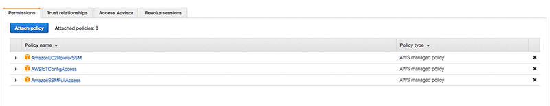 搜索 AmazonEC2RunCommandRoleforManagedInstances。我们希望将 AmazonSSMFullAccess 策略附加到此角色,从而使 Donkey Car 获得对 EC2 Systems Manager 的完全访问权限。让我们附加 AWSIoTConfigAccess,为我们的设备提供预置安全 IoT 证书的权限。