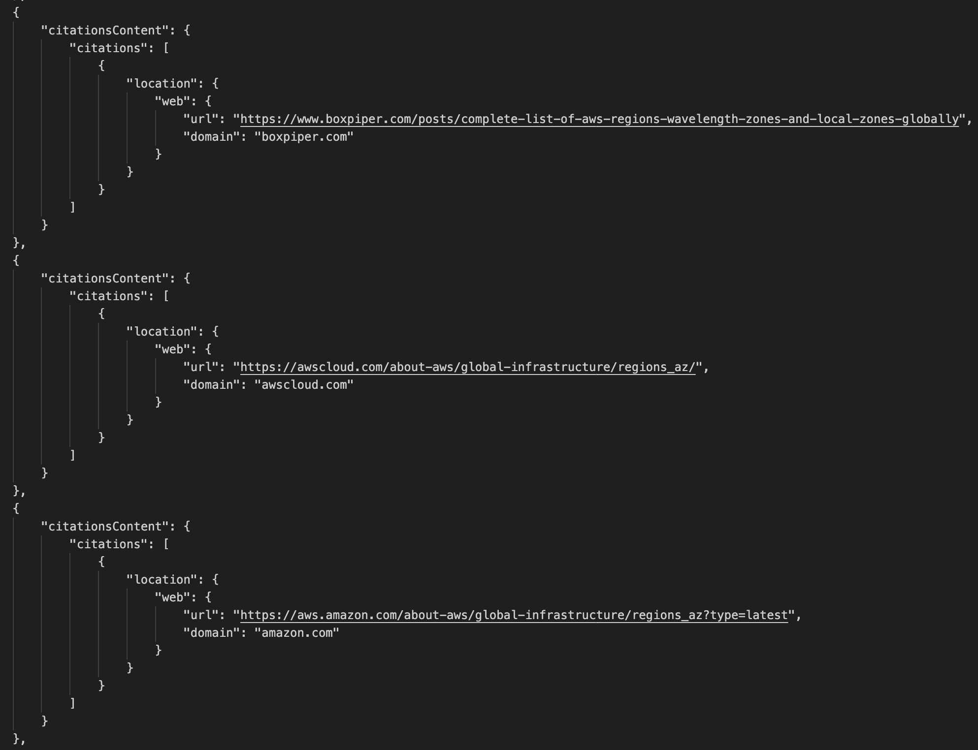 此外,输出还包含 citationsContent 对象,其中显示了有关 Web Grounding 所查询的来源的信息。