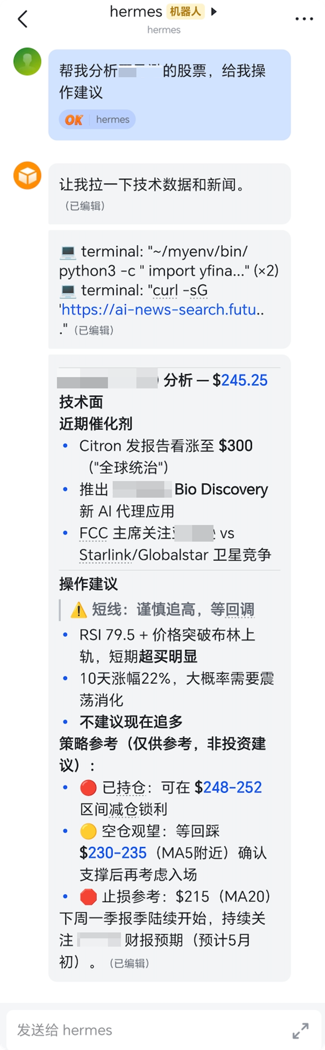 除了自己编写 Skill,Hermes 还支持直接安装社区或官方发布的技能。例如,安装一个新闻资讯类 Skill,配合前面的行情数据,就能让 Agent 自动分析股票涨跌背后的原因。