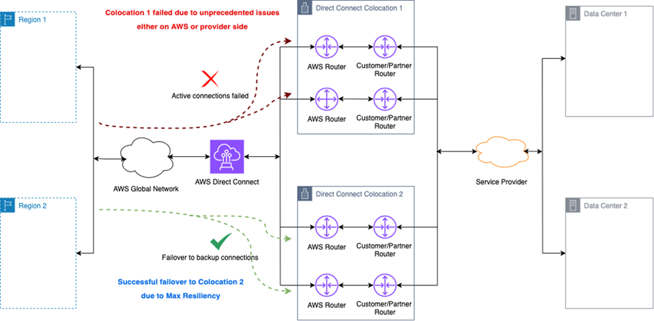 在更严重的情况下,若整个 Direct Connect 接入点失效(如图 1 所示),工作负载可无缝切换至另一接入点,从而实现超越单点级别的弹性,为大规模中断提供额外保护。