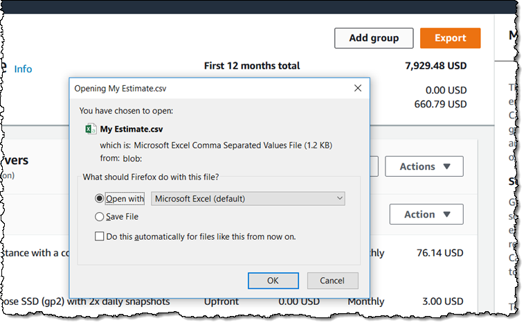 我可以单击 Export 以将我的估计导出到电子表格: