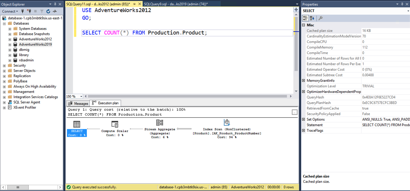 要验证向后兼容性维护旧的基数估计,请使用前文概述的一种迁移方法将数据库 (AdventureWorks2012) 从本地 SQL Server 2012 迁移到 Amazon RDS for SQL Server 2019。