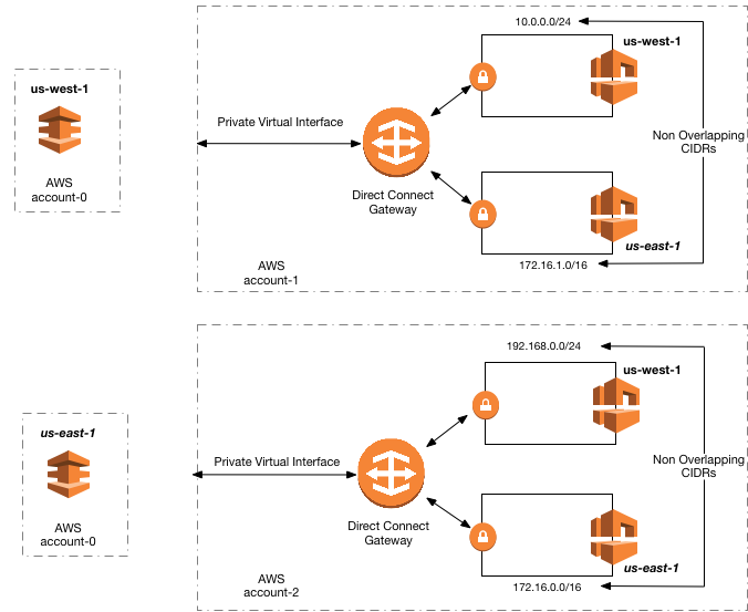 下图标注出了,有两个不同的region资源(us-west-1和us-east-1)的客户Account-0希望通过DX来给其下面的子账号Account-1和Account-2分别分配DX VIF,使其可以更快的访问放在us-west-1和us-east-1的VPC资源。这就需要用户分别在这两个region找DX partner开启DX服务,并且针对每个VPC创建一个VIF连接。