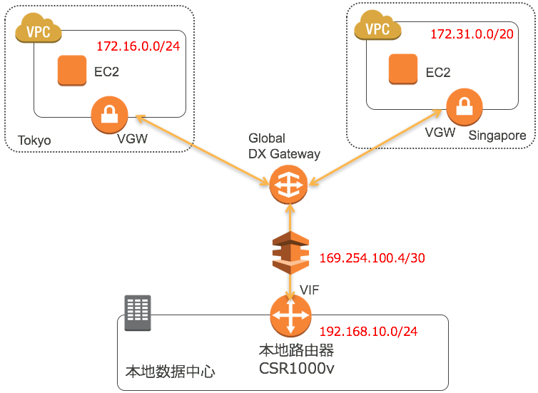 至此可以看到,用户可以仅通过创建一个private VIF接口就可以同时访问东京和新加坡的VPC内的EC2主机。