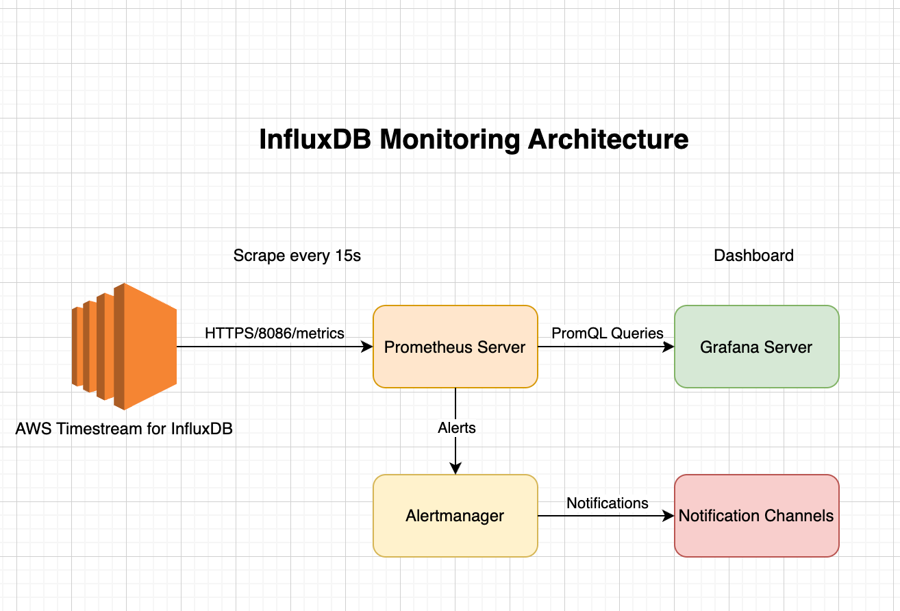为了确保Amazon Timestream for InfluxDB实例的稳定运行和最佳性能,建立一套完善的监控体系至关重要。本文将手把手教您如何使用Prometheus和Grafana构建一个企业级的监控解决方案,实现对Amazon托管influxDB的全方位监控。