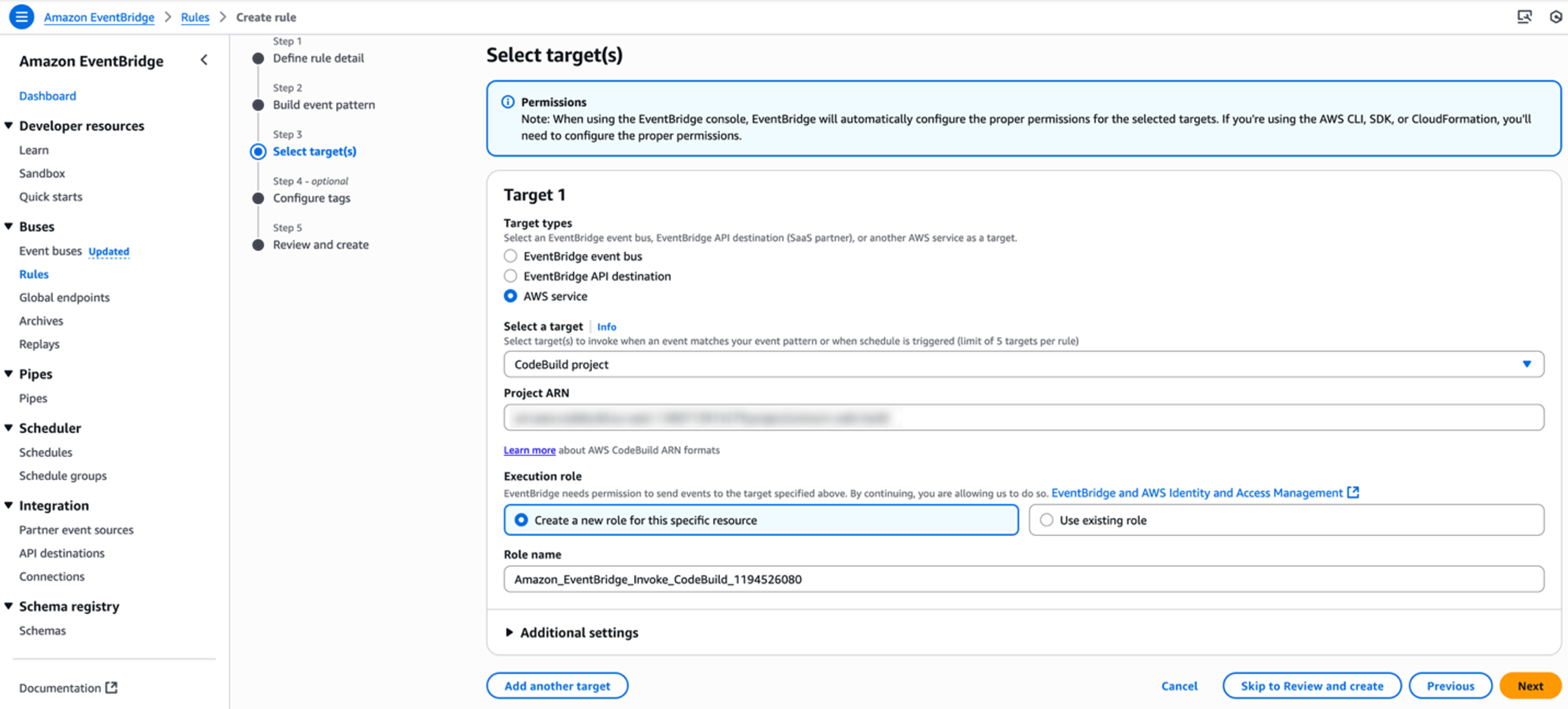 “Select target(s)”部分选择codebuild project作为目标,并填入Project ARN(ARN的信息可以在CodeBuild Project的“Project Details”中找到),选择默认创建新的角色