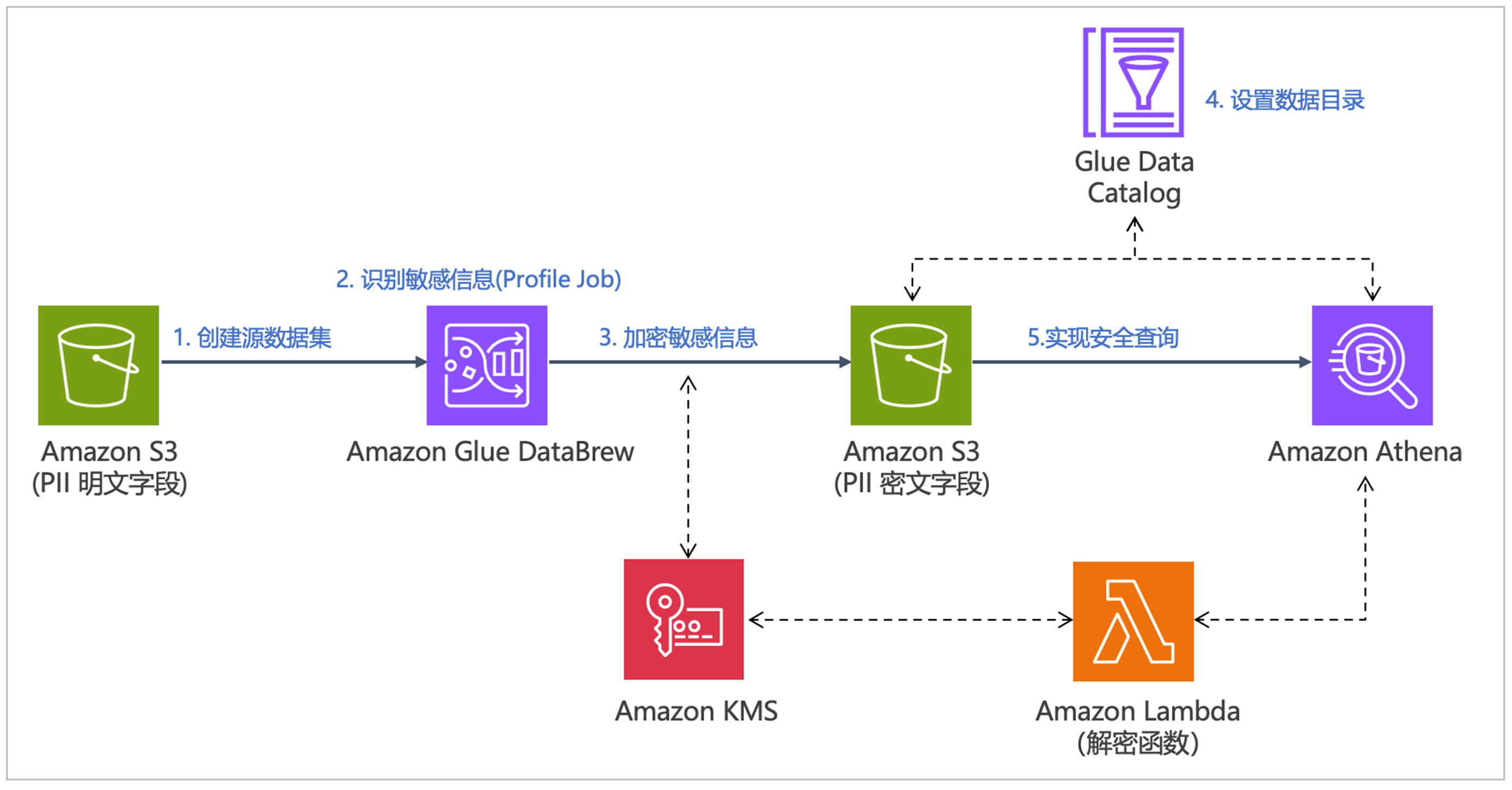 Amazon Glue DataBrew 是亚马逊云科技数据服务Amazon Glue中一款可视化数据处理工具。数据分析师不用编码,采用图形化的界面就可以对数据集进行操作。Amazon Glue DataBrew内置了多种功能,能够识别敏感数据并进行大规模预处理,其中一项关键功能就是对PII数据(如姓名、社保号、地址等)进行加密,防止数据泄露。虽然Amazon Glue DataBrew对加密的数据集提供了对应解密的方法,但是该方法仍然需要调用Amazon Glue DataBrew的Recipe解密方法进行数据解密处理,这不仅繁琐而且会形成多个副本,难以满足即时解密查询的要求。