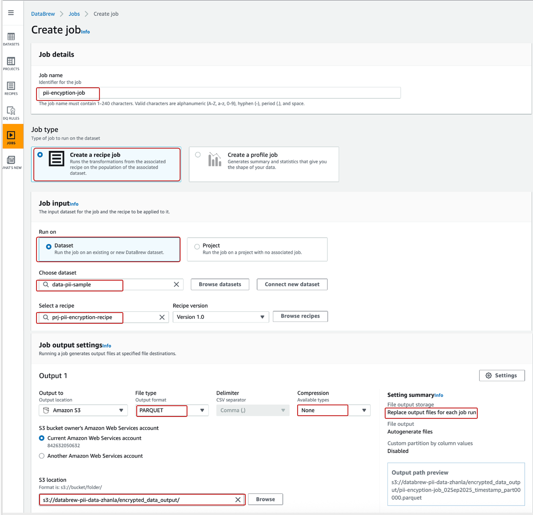 - 对于 S3 位置,选择 S3 输出为 s3://databrew-pii-data-zhanla/encrypted_data_output/。