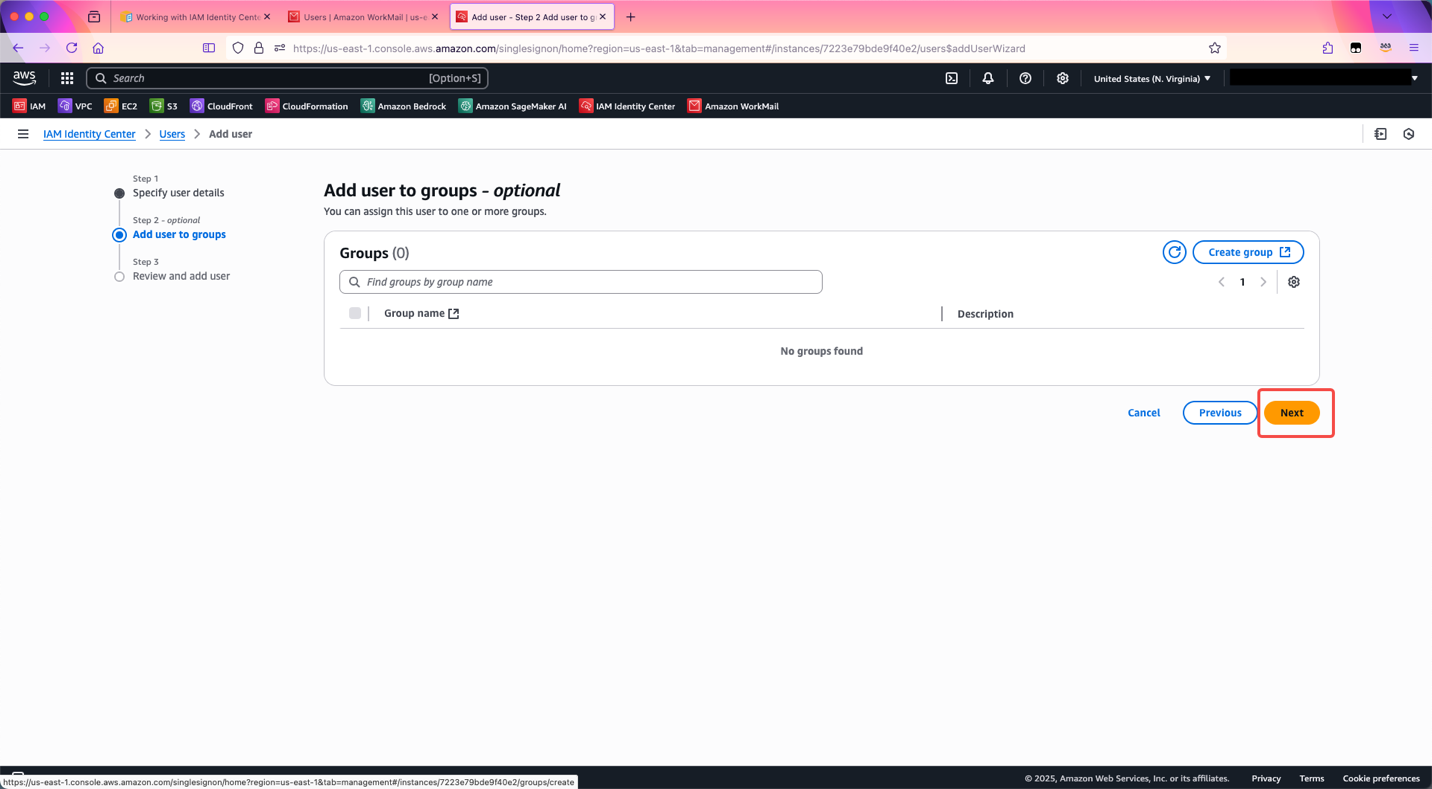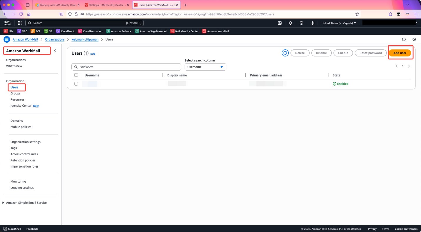 五、在 IAM Identity Center 服务和 Workmail 服务中分别添加用户