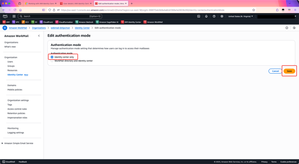 四、修改 Workmail 设置开启 IAM Identity Center 服务