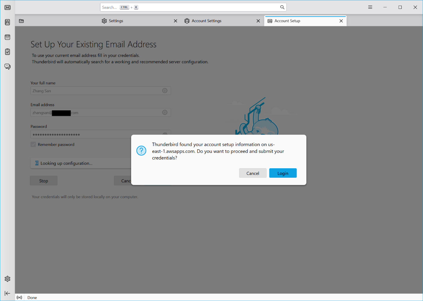 本文以安装 Thunderbird这个开源客户端为例,Thunderbird 支持 Windows、MacOS、Linux 等多个操作系统平台。安装完毕后,输入全名(即友好显示名称)、输入邮箱完整名(包含用户名和域名),最后在密码位置,输入 PAT 代替之前的用户单点登录密码。如下截图。