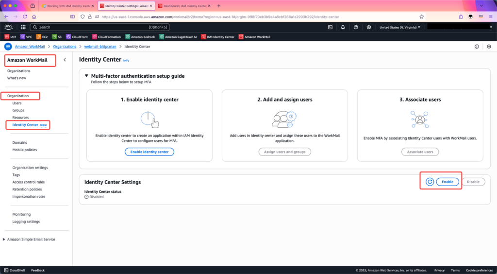 进入 Workmail 服务。点击左侧的 Organization,在左侧菜单找到 Identity Center,在右侧下方的设置中点击 Enable 按钮。如下截图。