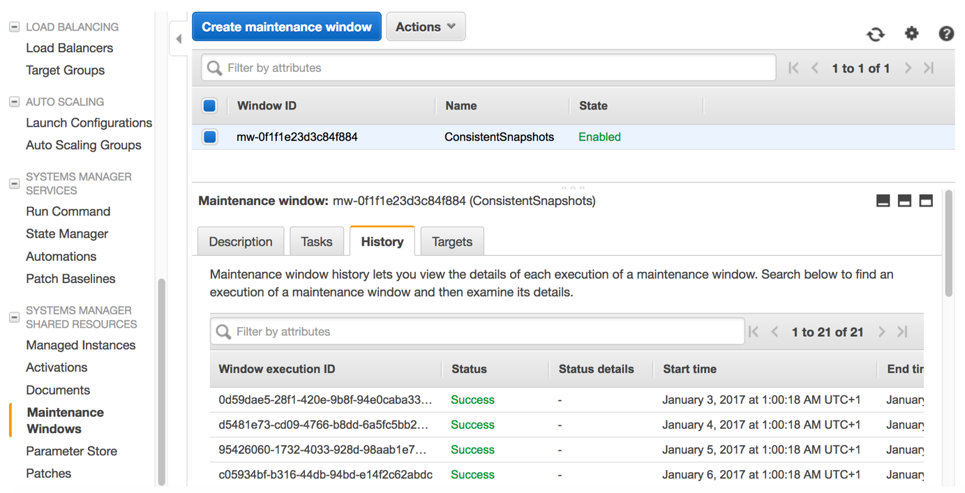 我们可以把以上脚本内容保存到一个SSM document中,并在Maintenance Windows中定义一个每天晚上12点执行该document的时间窗口,再将执行目标关联至所有“ConsistentSnapshot”标签的数值为“AmazonLinuxMySQL”的EC2实例。