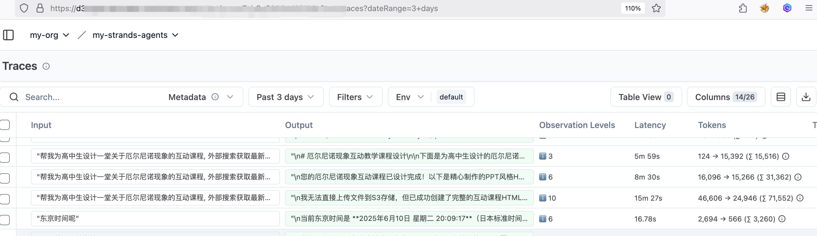 实际效果展示如图所示,我们可以追踪到每次 Agent 运行完整的输入和输出,以及对应的延迟、token 消耗等指标。