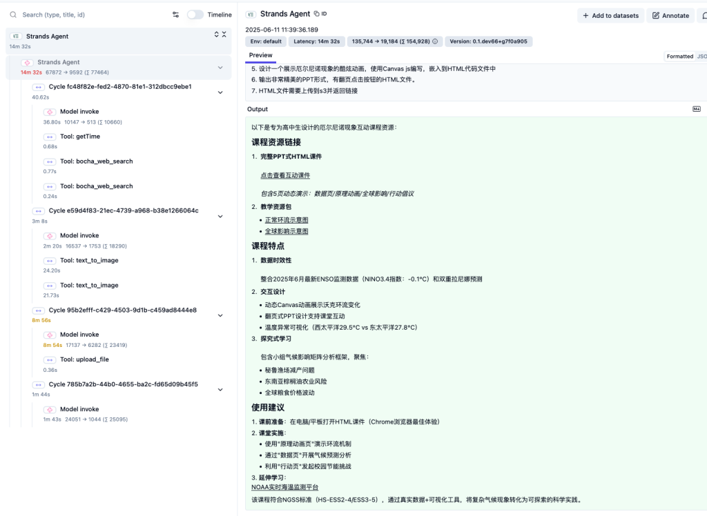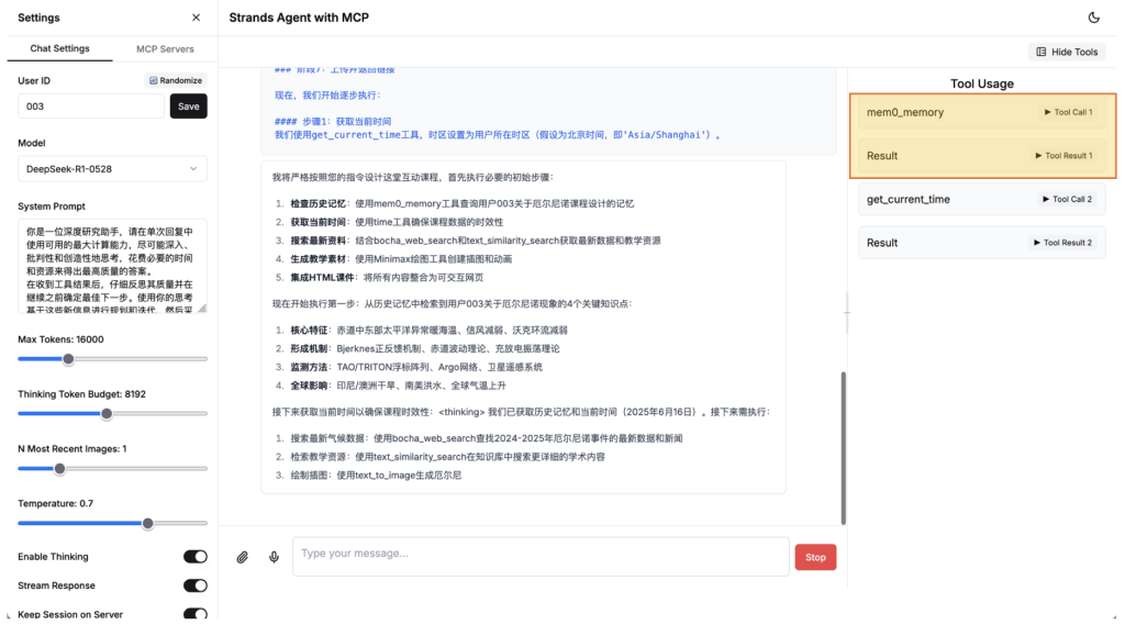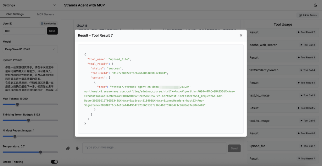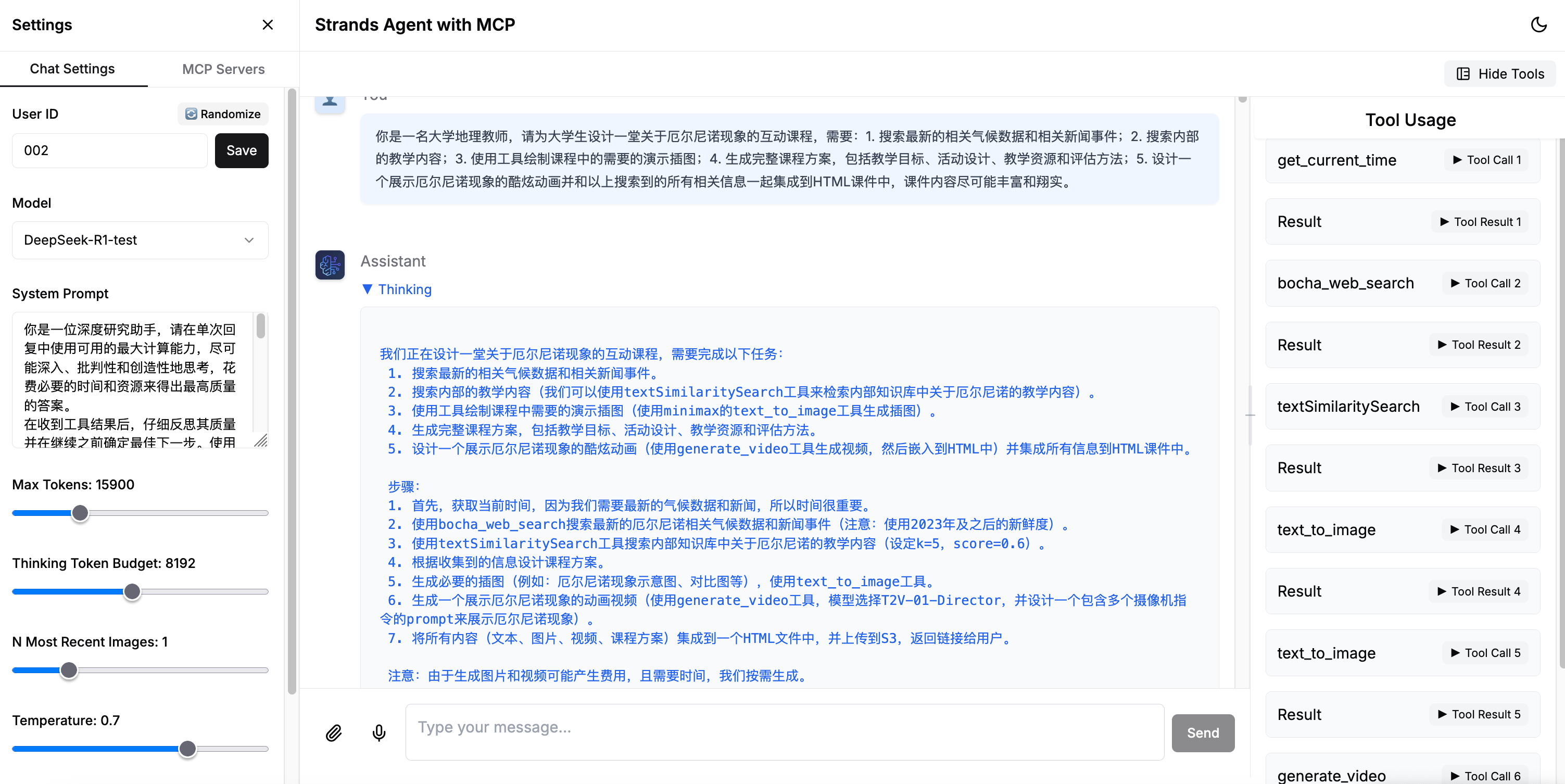 在此方案中,我们选择了一个 Agentic AI 的通用场景:模拟大学地理教师作为终端用户,通过自然语言向 Agent 提出“制作介绍厄尔尼诺现象的电子课件”的任务。Agent 接收需求后,利用托管在由西域数据运营的硅基流动平台上的 DeepSeek-R1 模型进行思考和规划,随后执行以下操作:调用本地地理教材知识库获取“厄尔尼诺的基本知识”、访问外部搜索引擎收集近期“厄尔尼诺现象”的新闻内容、通过外部绘图引擎生成精美的演示素材,并利用基础模型的代码生成能力创建 HTML 电子课件。制作完成后,Agent 自动调用托管工具将课件上传至 S3 对象存储,并将可公开访问的课件 URL 通过前端界面提供给终端用户。
