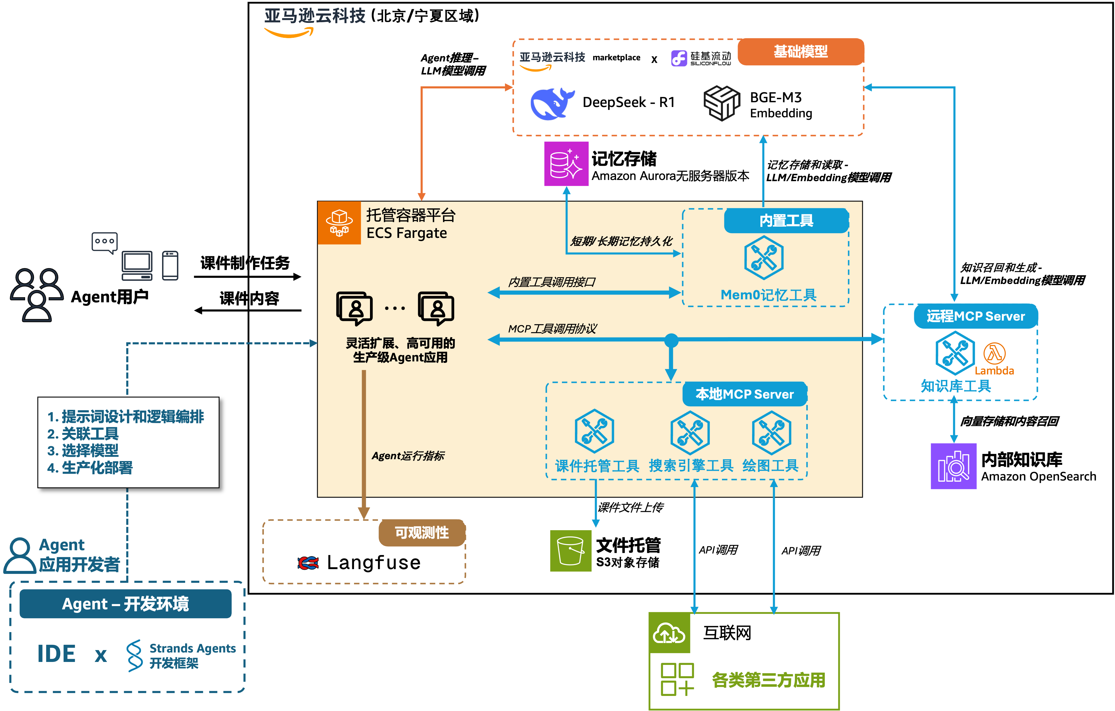 如图所示,开发者可以使用本地开发环境安装 Strands Agents 框架,完成 Agent 构建工作,包含提示词设计和逻辑编排、工具关联、模型选择和生产化部署四个部分。在云端,我们借助 ECS Fargate(高可用、灵活扩展的弹性容器资源,无需自行管理服务器)实现 Agent 应用部署,并通过托管在硅基流动 DeepSeek-R1 的 API 服务提供 Agent 思考和规划能力。在工具层面,Strands Agents 内置了多种 Agent 常用工具,使用起来极为简便,如图中所示的 Mem0 记忆工具,它直接使用 Strands 提供的 Mem0 接口,基于云上 Amazon Aurora PostgreSQL 无服务器化的能力快速构建记忆持久化;此外,Strands Agent 原生支持 MCP 协议,可以轻松关联内部、外部工具能力,方案中在 Agent 应用部署的本地构建了三个 MCP Server,分别调用 Amazon S3 来托管展示制作好的课件文件、调用外部搜索引擎实现最新信息查询、调用外部绘图服务来制作精美的课件内容;同时,还提供了在亚马逊云平台上基于 Amazon Lambda 构建远程 MCP Server 的方法,将 Amazon OpenSearch 知识库工具能力和 Agent 关联起来。这里的记忆和知识库模块都使用了硅基流动托管的BGE-M3-Embbeding模型完成向量化。在可观测性方面,Strands Agents 原生支持基于开源框架 Langfuse 实现运行指标收集和调试能力,只需配置端口即可完成。以上整体方案都完全托管在亚马逊云科技中国区服务中,可以一站式地实现开发、调试和生产工作。