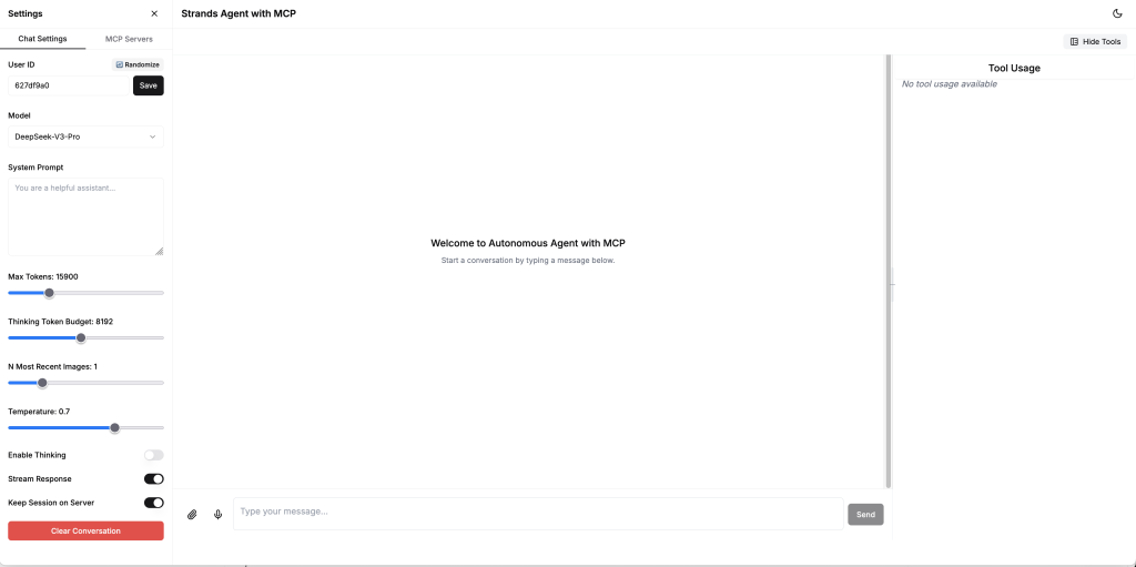 部署完成后,您可以使用部署完成后输出的 AlbDnsName(参考图 5 红框部分),在浏览器中输入该地址,并加入后缀/chat(形如 http://{AlbDnsName}/chat),即可访问 Agent 前端页面。整体会话是按照图示中 User ID 来管理的(如记忆、可观测性指标、输出物等),请在 User ID 中确认具体的 ID 名称(可以使用“Randomize”按钮随机生成)。