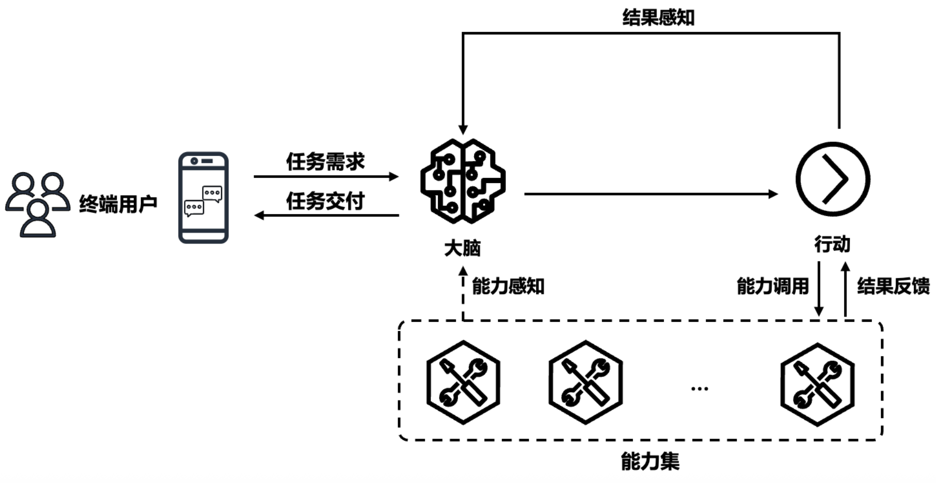 图中右侧的“行动”和上方的“结果感知”构成了 Agent 的执行与反馈闭环。行动是 Agent 根据大脑的决策执行具体的能力执行,可能是生成一段文本、进行一次计算、发送一个请求或控制一个设备。结果感知则是 Agent 对能力执行后的观察和评估,它通过这种感知来判断行动是否达到了预期效果,是否解决了用户的问题。这个闭环使 Agent 能够自我优化,不断调整能力执行的策略以提高成功率。用户可能不直接看到这个过程,但会体验到 Agent 在多次交互中的学习和适应能力。一个具有良好结果感知能力的 Agent 会随着使用逐渐变得更加智能和个性化,越来越符合用户的期望和需求。