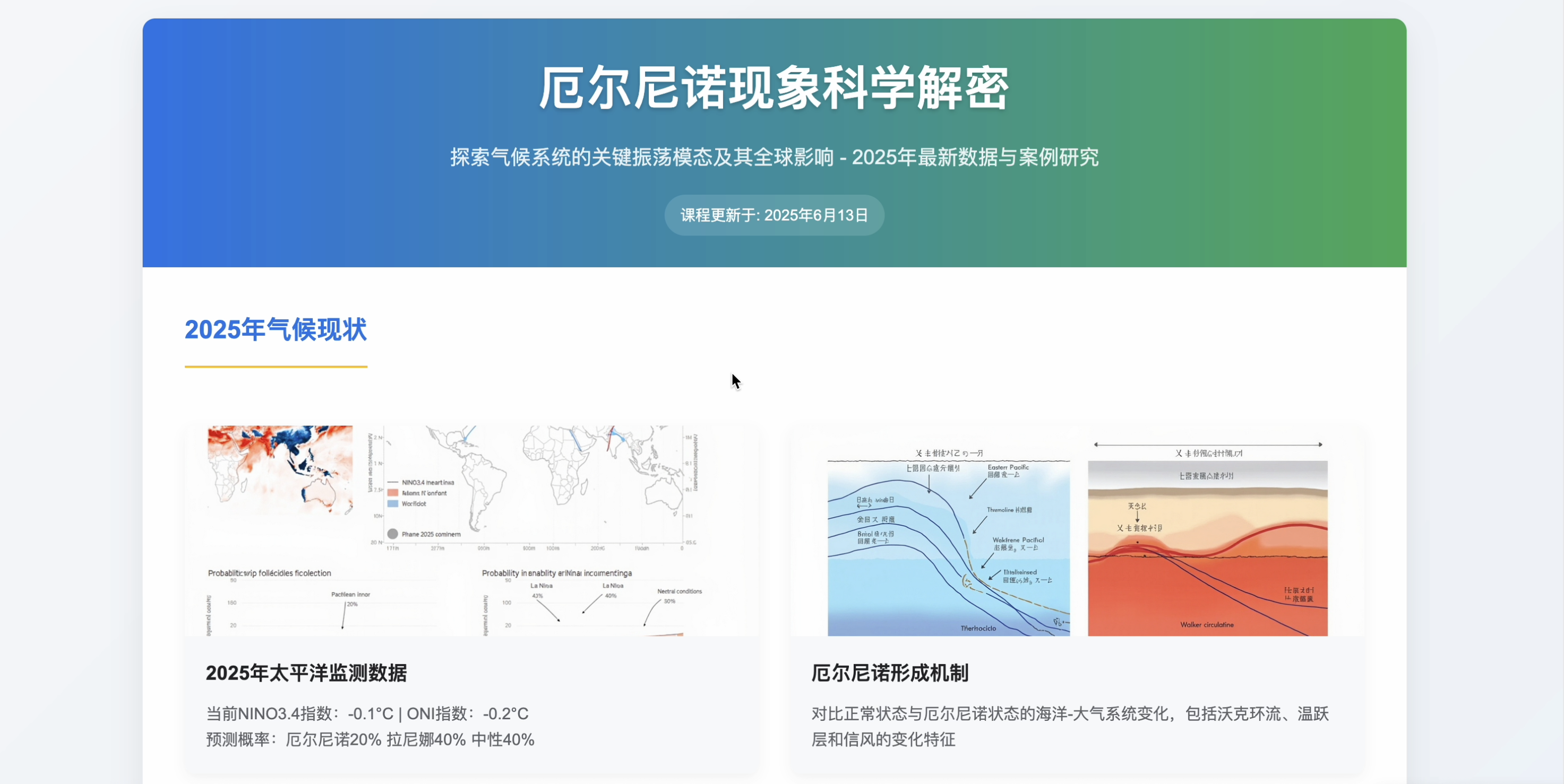 你是一名大学地理教师,请为大学生设计一堂关于厄尔尼诺现象的互动课程,需要:1. 搜索最新气候数据和相关新闻事件;2. 搜索教学资源和真实图片;3. 使用工具绘制课程中的需要的演示插图;4. 生成完整课程方案,包括教学目标、活动设计、教学资源和评估方法;5. 设计一个展示厄尔尼诺现象的酷炫动画并和搜索到的相关信息一起集成到HTML课件中。