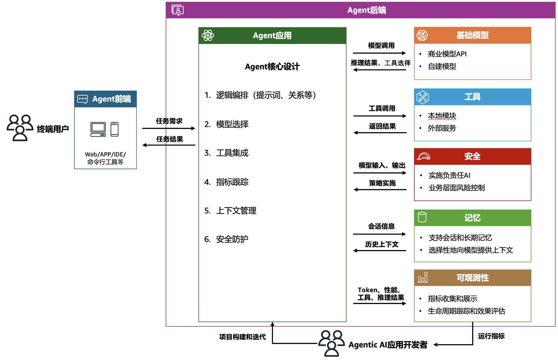 后端是整个系统的中枢神经,包含 Agent 核心设计的六大关键功能。首先是逻辑编排,包含系统提示词、组件的映射关系(如将某个需求拆解成不同的子任务,进行串、并、循环等逻辑执行,但该开发范式不是必须)等,构建任务执行框架,技术上通常采用有向图结构或状态机模型,确保任务流程清晰可控;其次是模型选择,根据任务特性选择最适合的生成式 AI 基础模型,可能涉及模型路由、多模型协作等更高级策略;第三是工具集成,将各类功能工具和 Agent 对象进行关联,扩展 Agent 能力边界;第四是指标跟踪,监控系统运行状态、性能表现和资源消耗,为优化提供数据支持;第五是上下文管理,维护会话状态,处理长短期记忆,实现连贯的对话和业务体验;最后是安全防护,内置安全检查机制,防止有害输出和潜在的业务风险。