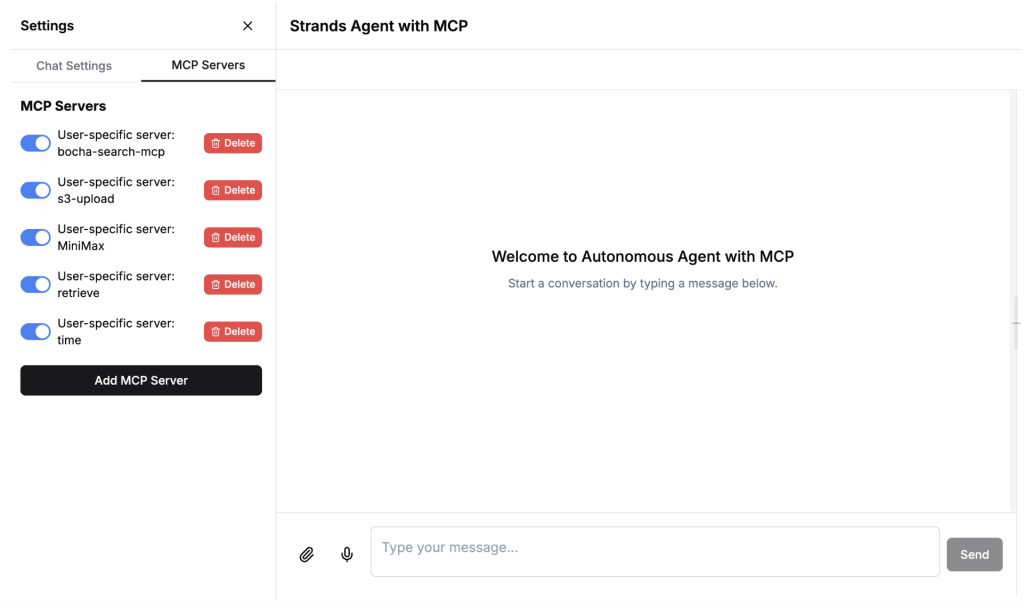 将左边栏切换到 MCP Servers 选项卡,由于当前 User ID 下没有注册任何 MCP Server,点击“Add MCP Server”按钮添加依次添加所需要的 MCP Server: