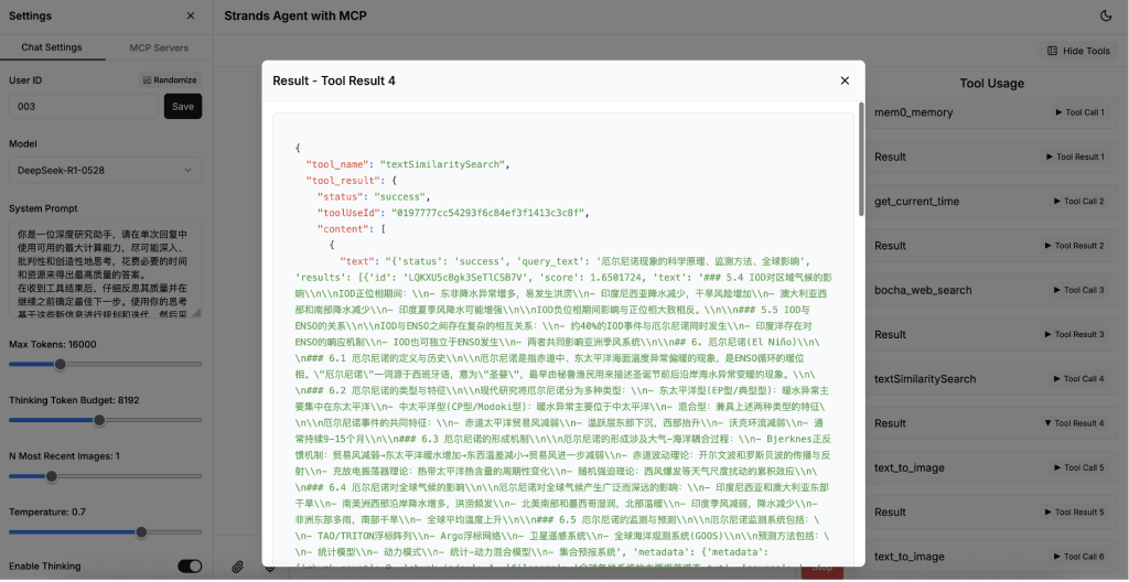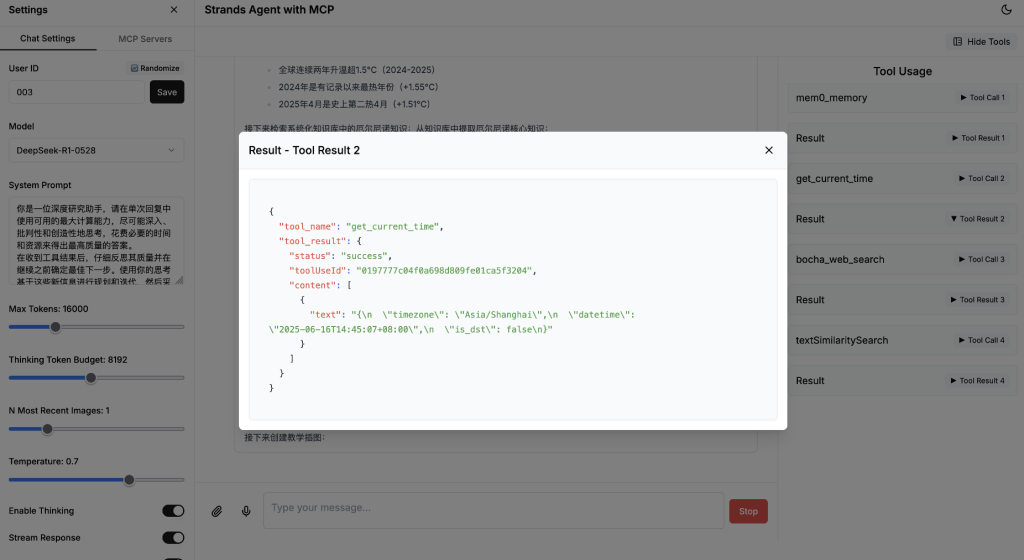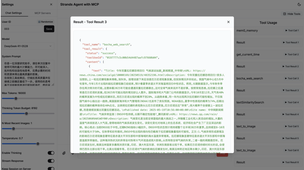在这个核心示例代码中,我们创建了一个单体 Agent,为其提供了 MCP 工具和内置的长短期记忆管理工具(mem0_memory),同时指定了模型和上下文管理器 conversation_manager(用于管理最长的消息长度,避免 context 过长),以及系统提示词。通过这种简单的方式,我们就能创建一个具有自主推理能力、能够使用各种外部工具、并拥有长短期记忆和上下文管理功能的 Agent。