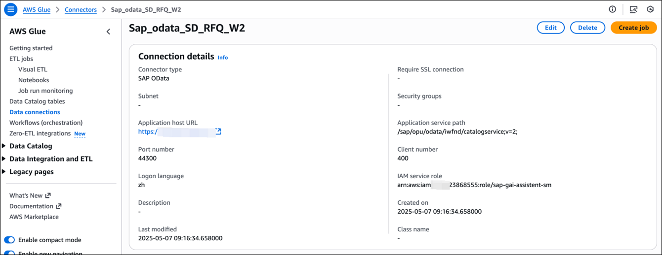 创建AWS Glue OData Connection时,提供配置连接的 SAP OData 实例的应用程序主机 URL和SAP OData 实例的应用程序服务路径等信息,AWS Secrets Manager 用于安全存储 SAP 凭证等敏感信息,AWS Glue 作业可以在运行时动态检索信息,从而增强了安全性和灵活性。