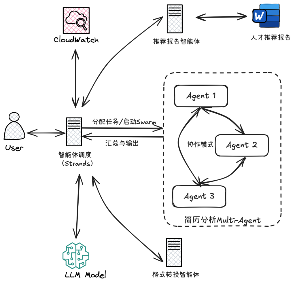 - 显著提升简历筛选效率:Strands Agents SDK 引入先进的 Swarm 架构,支持多智能体并发处理,能够同时对大量简历进行筛选与评估,大幅缩短整体招聘周期。