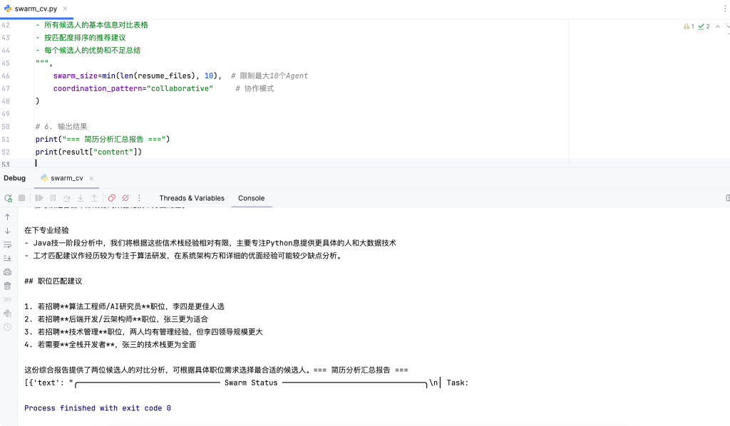 这一架构不仅支持多任务同时运行,还能动态调度和协调各智能体的工作流,确保系统高效稳定地应对大规模候选人数据。对于企业而言,Swarm 架构意味着能够在保持高质量筛选标准的同时,实现招聘流程的自动化和规模化,显著增强招聘效能。