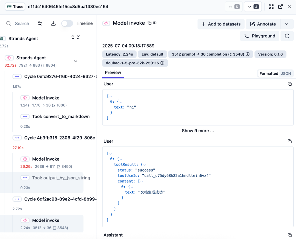 招聘过程中如遇模型响应慢或评分异常,可通过集成的可观测平台实时告警与分析,帮助企业快速定位筛查瓶颈。Strands Agents SDK 提供了企业级的可观测能力,帮助开发者全面监控和调试智能体的运行状态。通过与开源的 Langfuse 平台深度集成,用户可以实现对智能体执行过程的详细追踪,包括大语言模型调用、工具使用、输入输出数据、响应时延及成本等关键指标。
