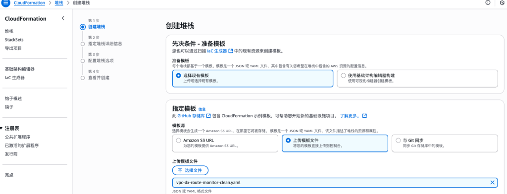 2. 去网站控制台 CloudFormation 功能,上传刚才创建的 CloudFormation.yaml 文件