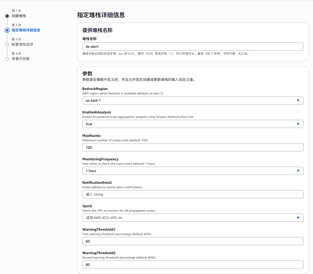 3. 输入监控必须项目,填写预警所需邮箱(选择已经学习 DX 路由的 VPC),并点击下一步
