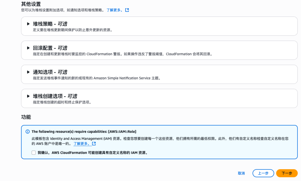 4. 勾选我确认,同意系统所需最小授权,并点击下一步完成堆栈部署