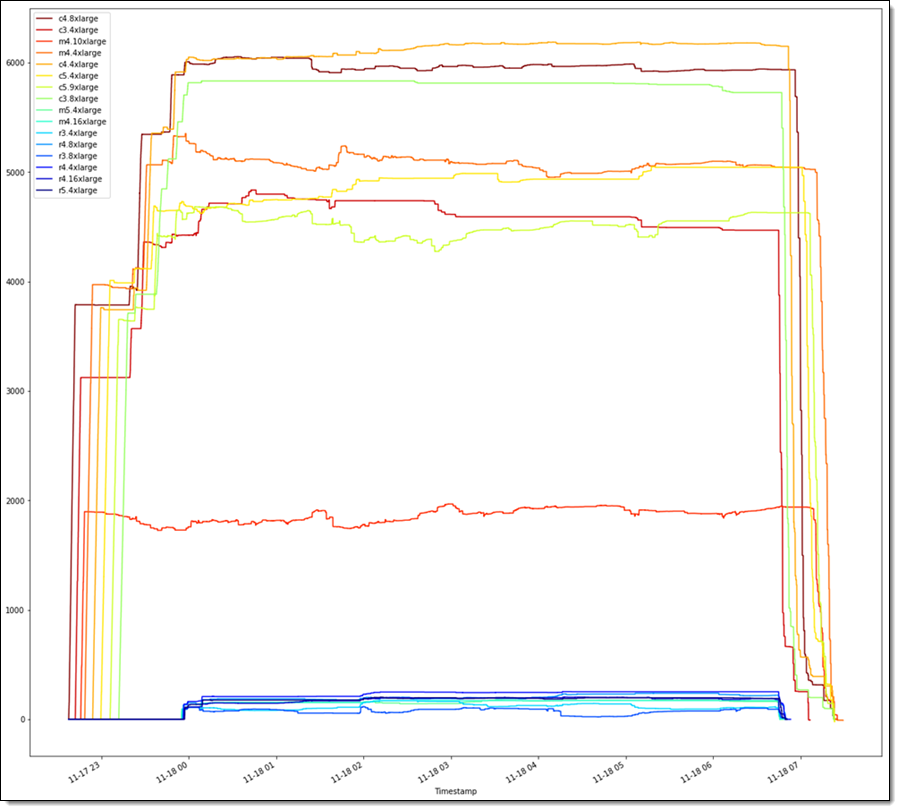 该作业涉及到美国东部(弗吉尼亚北部)区域中的所有 6 个可用区。Spot 报价以按需价格为依据。在运行过程中,机组中大约 1.5% 的实例被终止并自动更换;绝大多数实例都全程保持正常运行。