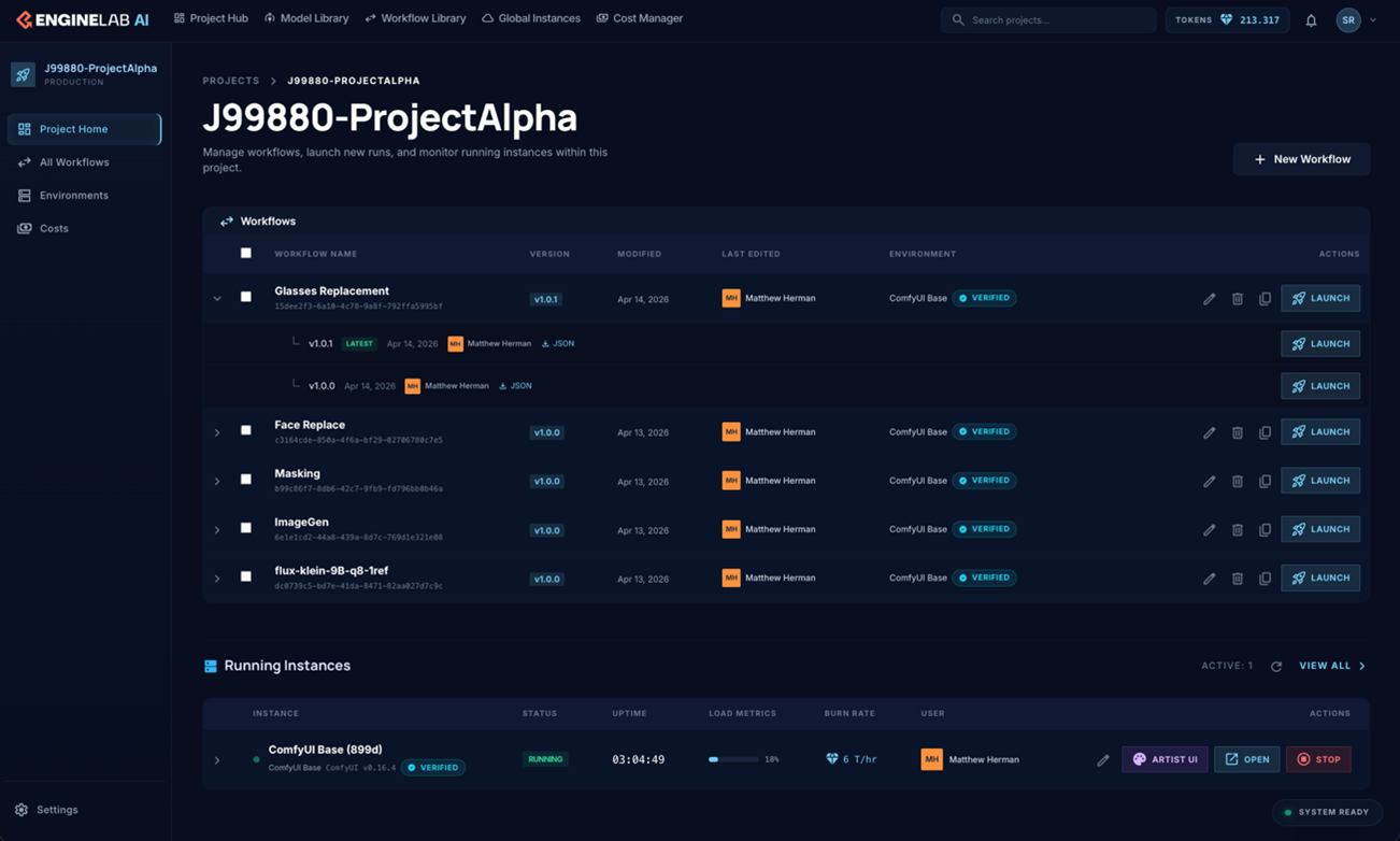 Figure 1: EngineLab AI’s project management interface showing how administrators track workflows, monitor resources, and manage artist access. Workflows are defined with relevant versions, contributing artist details and applications, and the ability to launch sessions. Running sessions are shown with their utilization statistics such as uptime.”