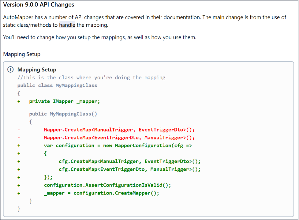 Many of these issues dealt with third party API changes, such as AutoMapper. We created documentation that was easy to follow and read like a git pull request.