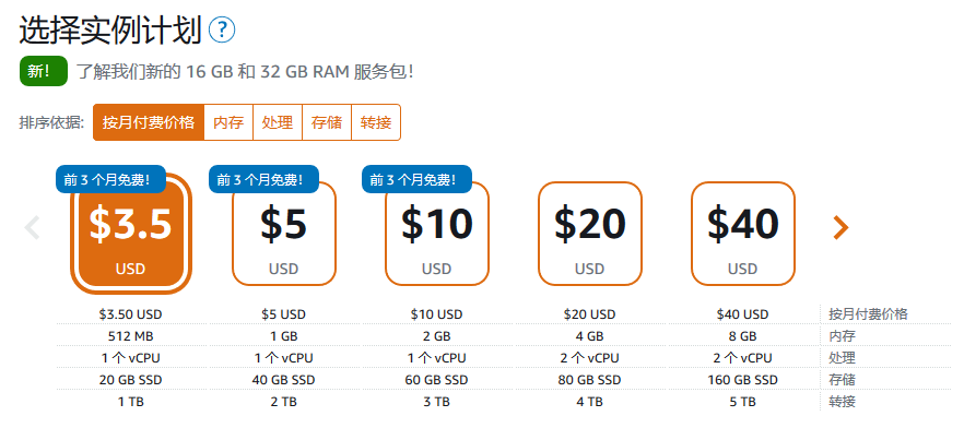 计划包括便宜且可预测的价格,机型配置(内存,硬盘,处理器),以及数据传输配额。最低只需每月3.5 美元即可体验 Lightsail (最高 750 小时),无需额外花销。现在还有 3 个月免费活动,点击查看免费高配机型