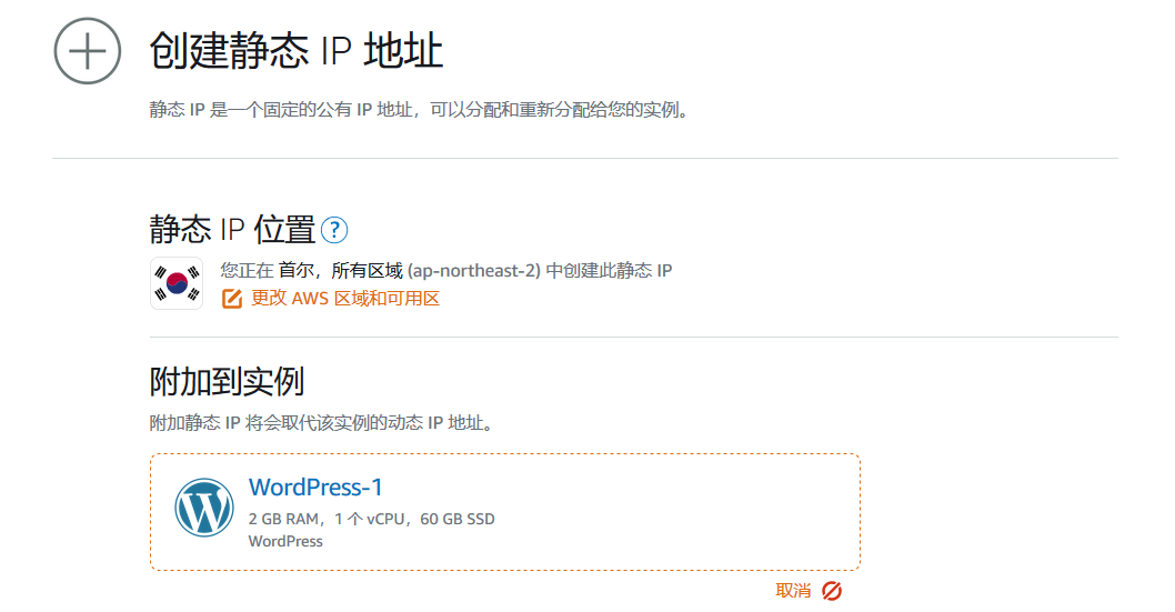完成以下操作,即可建立一个静态的 IP 地址,并附加到您的 WordPress 实例上。