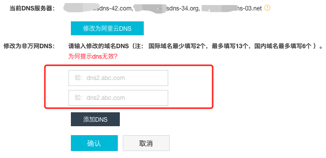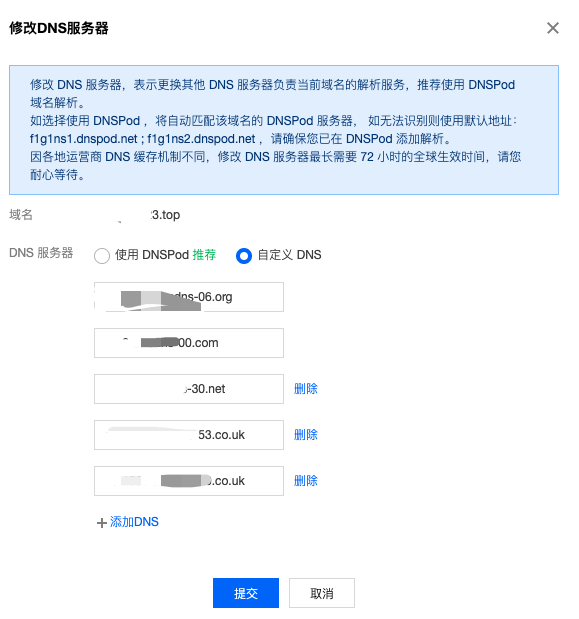 点击添加DNS然后将在步骤1.2中获取的NS地址添加上去,并提交。同样的,您需要等待该修改生效。