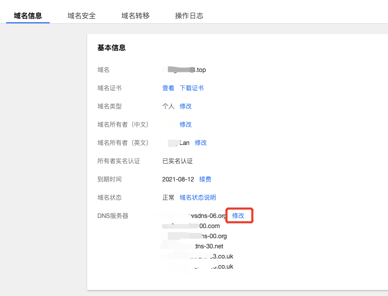 接下来,需要在购买域名的服务商,修改域名的域名服务器(Name Server)设置。我们分别以阿里云、腾讯云以及GoDaddy为例进行介绍,其他平台的域名可参考其官方手册。