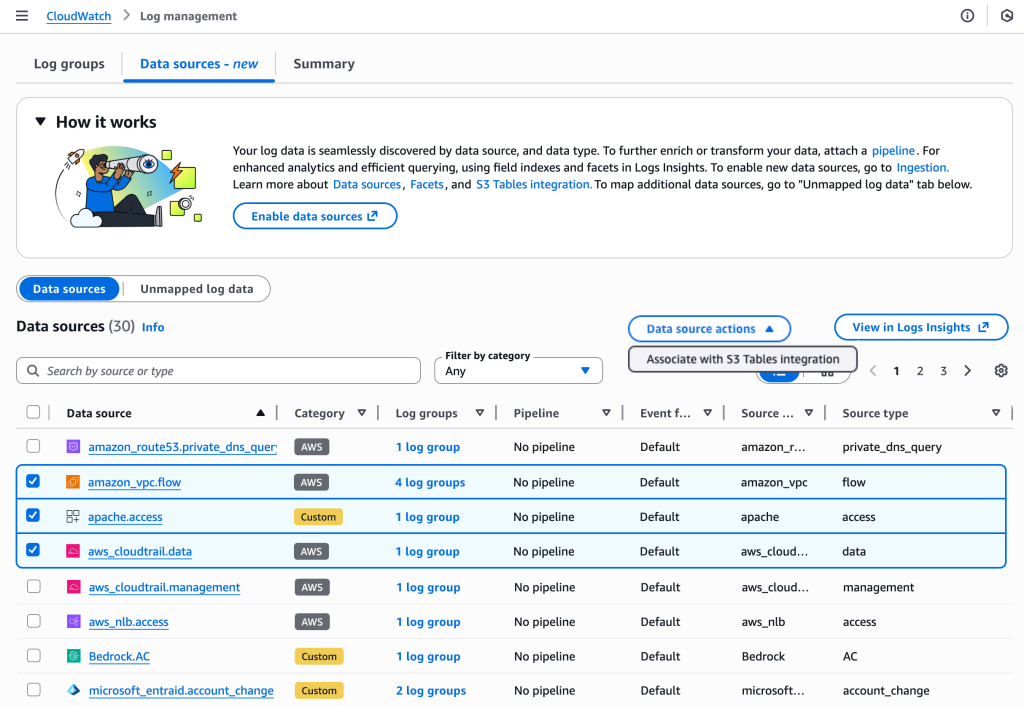 Wählen Sie Data source actions, um S3 Tables zu integrieren, um zukünftige Logs für ausgewählte Datenquellen verfügbar zu machen. Sie haben die Flexibilität, die Logs über Athena und Amazon Redshift sowie andere Query-Engines wie Spark mit Iceberg-kompatiblen Zugriffsmustern zu analysieren. Mit dieser Integration sind Logs aus CloudWatch in einem schreibgeschützten aws-cloudwatch S3 Tables Bucket verfügbar.